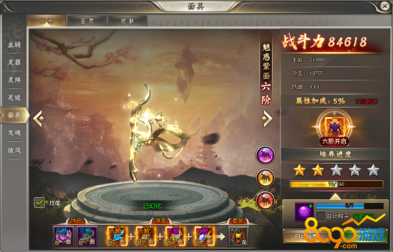 通过面具培养丹即可提升面具星级,满5星后面具将自动进阶,获得更酷炫的外观