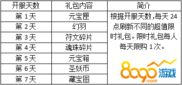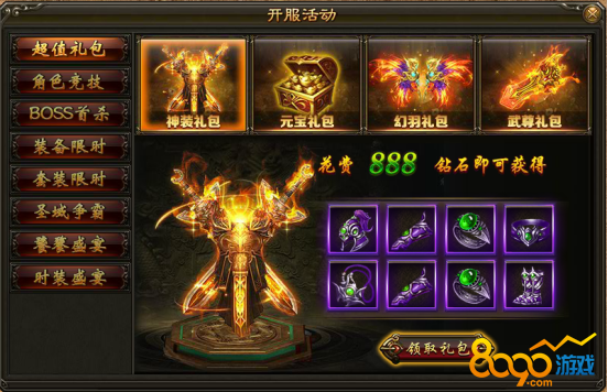 活动期间内玩家可花费少量钻石购买丰厚礼包,礼包可快速提升装备等级、翅膀阶数,更有海量元宝任性使用。