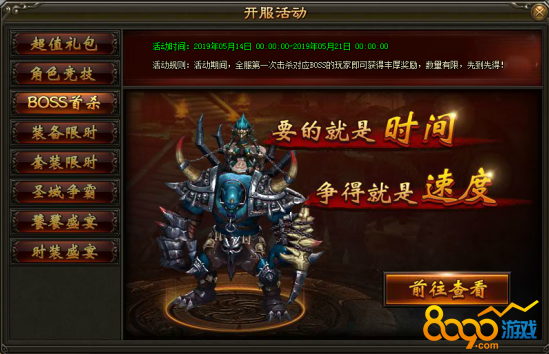 活动期间内,全服第一次击杀对应BOSS的玩家即可免费领取丰厚奖励,数量有限,先到先得!