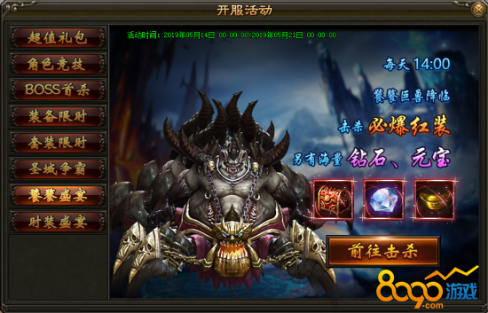 开服前七天,每天14:00饕餮巨兽降临,击杀必爆红装,另有海量钻石元宝爆出。