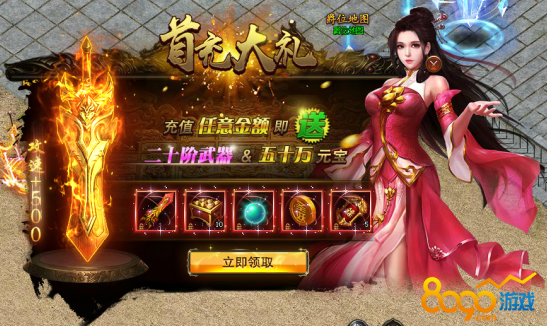 首次充值任意金额玩家立刻直升1级,还有攻速+500的20阶武器、50万元宝与1000圣妖币等豪华大礼!