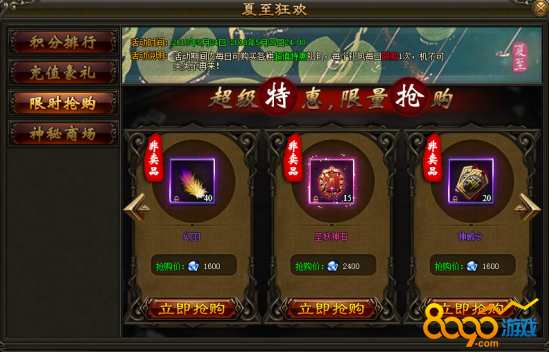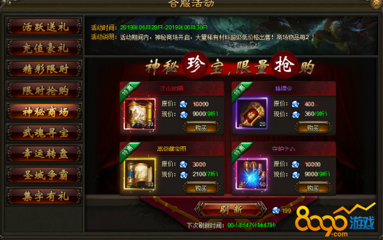 b) 活动说明:活动期间内,神秘商场开启,大量稀有材料超级低价格出售!商场物品每2小时或全部购买时立即刷新,花费199钻石可立即刷新,每样道具限购一次。