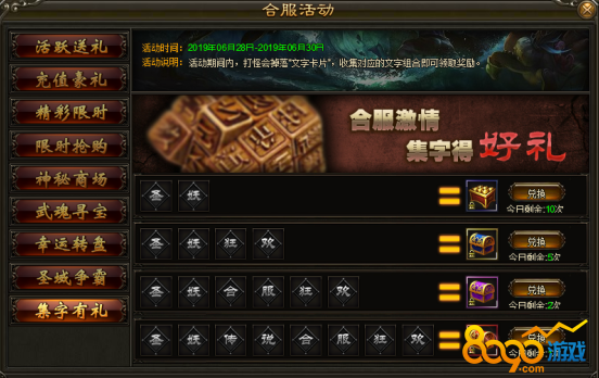 b) 活动说明:活动期间内,打怪会掉落“文字卡片”,收集对应的文字组合即可领取奖励。奖励所有玩家均可领取,抓紧机会不要错过!