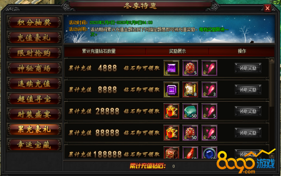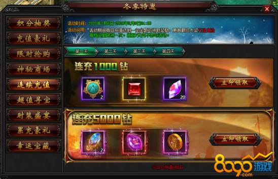2.2 活动期间内,每日充值达指定钻石数额,即可领取充值奖励,可原每日充值奖励叠加领取