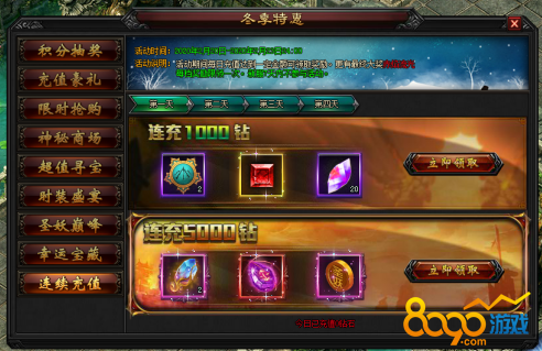 2.2 活动期间内,每日充值达指定钻石数额,即可领取充值奖励,可原每日充值奖励叠加领取
