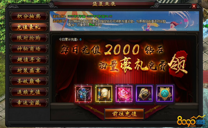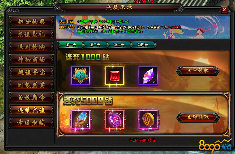 2.2 活动期间内,每日充值达指定钻石数额,即可领取充值奖励,可原每日充值奖励叠加领取