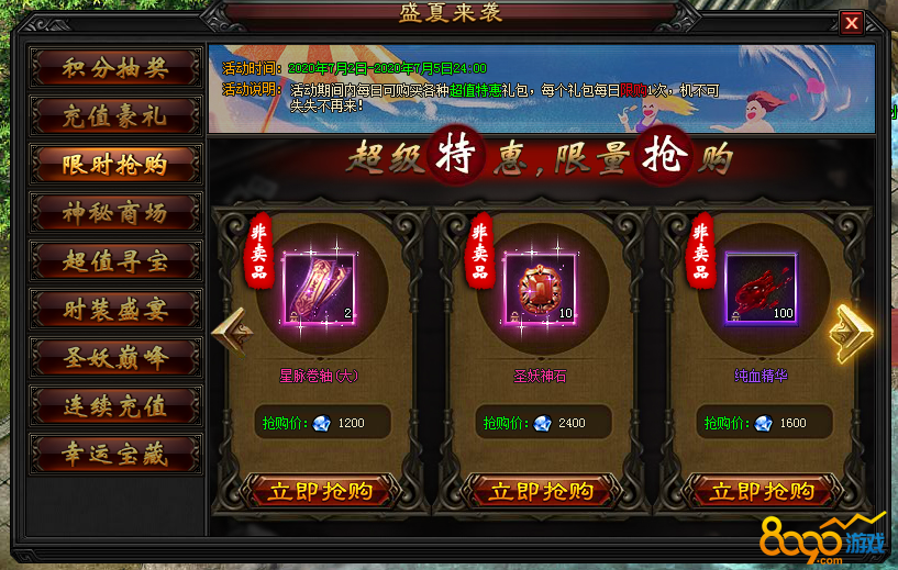 3.2. 活动期间内,每日可购买各种非卖品特惠礼包,每个礼包每日限购1次。