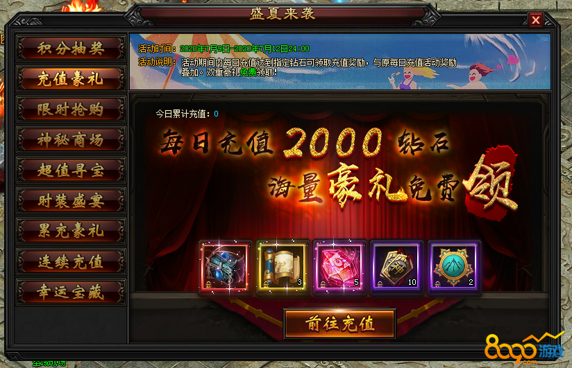 2.2 活动期间内,每日充值达指定钻石数额,即可领取充值奖励,可原每日充值奖励叠加领取