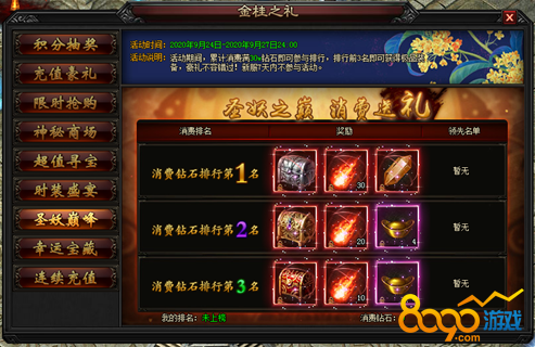 7.2 活动期间内,累计消费钻石达到对应的金额即可参与消费排名,活动结束后排名前三的玩家可在邮件处领取对应的奖励!