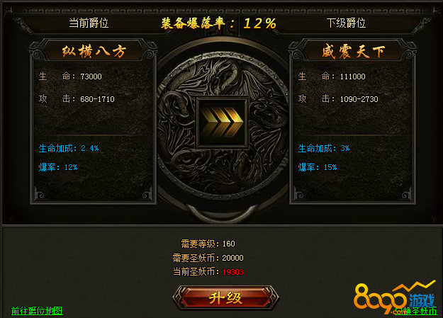 爵位给角色增加的属性有4种,分别是生命、攻击、生命加成和爆率。这边重点要说的是生命加成和爆率这2种属性。生命加成是可以按百分比来增加角色的属性,而爆率就是指击杀boss之后掉落物品的概率。特别是爆率这种属性可以说是玩家梦寐以求的。爵位的等级越高这4种属性增加的就越多。爵位可以通过消耗圣妖币来进行升级。