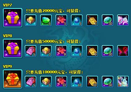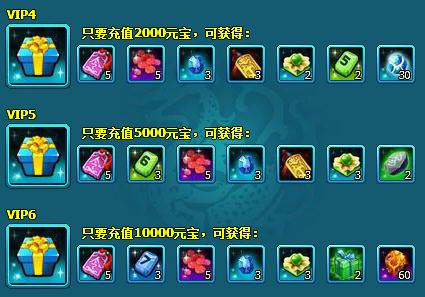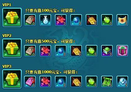 活动内容:玩家通过充值元宝可以提升VIP等级,高级VIP能够继承低级VIP的所有特权。