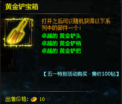 五一活动最有意思的就是出售的挖宝铲推出了黄金版和更牛叉额纯2k挖宝铲了,当然了活动还是到游戏中只要替换下就是双卓越黄金套装了。