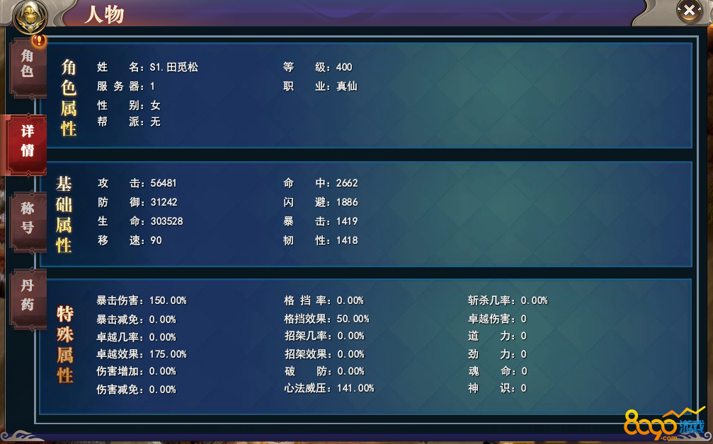 在详情子功能中,用户可以查看到角色的详细属性数值,这些属性数值不仅包括攻击、生命、防御、命中、闪避、暴击、韧性等基础属性,还包括力量、体质、身法、根骨等高级属性。