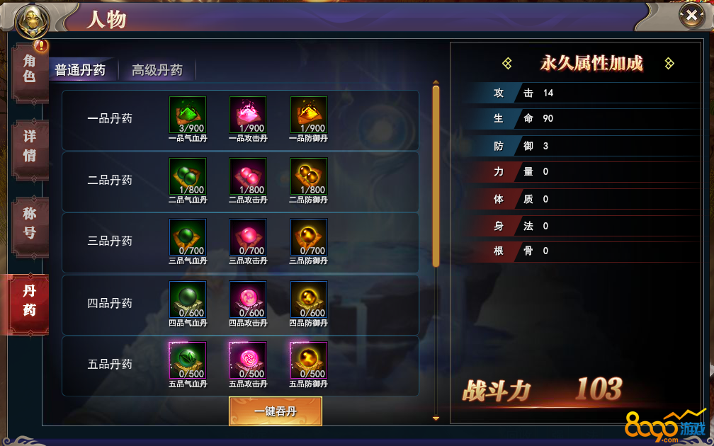 在丹药子功能中,用户可以服用各种丹药来增加自己的属性值。丹药产出自游戏中的各种系统,如任务、副本、在线奖励等,用户也可以花费货币购买丹药来达到快速提升的效果。