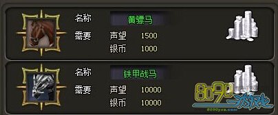 坐骑既可以用金币购买,也可以用声望购买,获得坐骑后,将会为角色带来属性加成,此外坐骑还有自己的专属技能,玩家可以使用经验书提升坐骑等级,也可以带着坐骑去刷怪,记得要点参战才能得到经验。