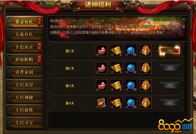 2、活动说明:活动期间,每日登陆可领取免费礼包一份,登陆越多礼包越丰厚哦。