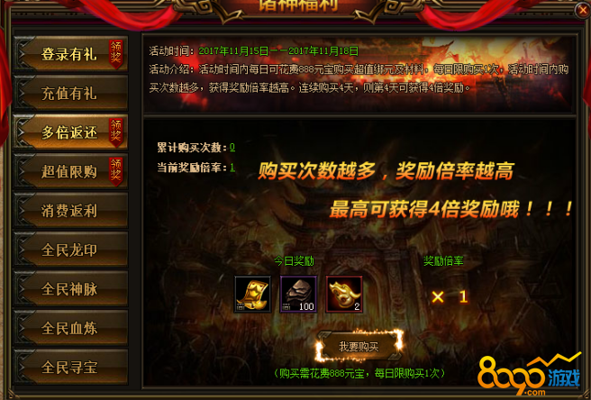 2、活动说明:每天花费888元宝,可以购买超值绑元及材料。每日限购一次,购买次数越多,获得奖励倍率越高,第四天可领取4倍奖励