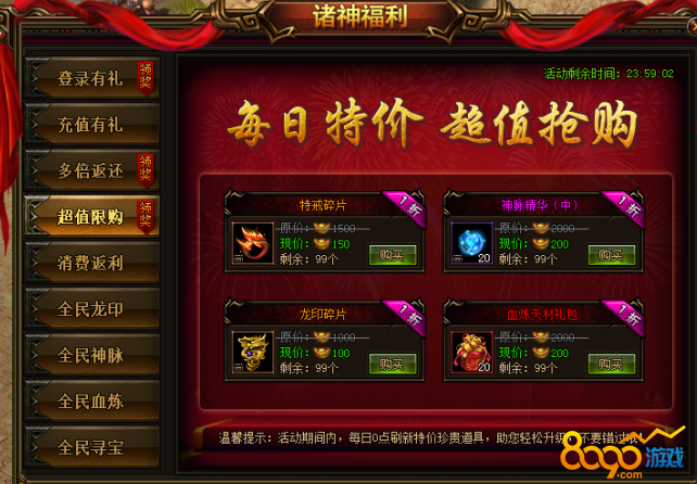 2、活动说明:活动期间内,每日0点刷新特价珍贵道具。