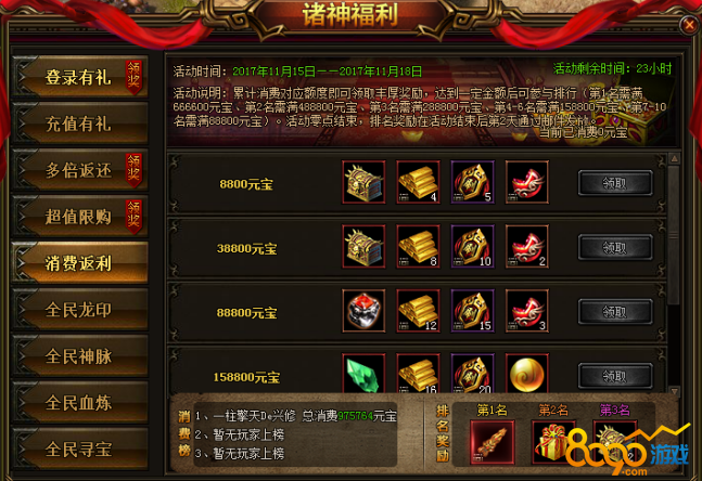 2、活动说明:累计消费对应额度可领取丰厚奖励,达到一定金额后可参与排行活动零点结束,排名奖励在活动结束后第二天通过邮件发放。