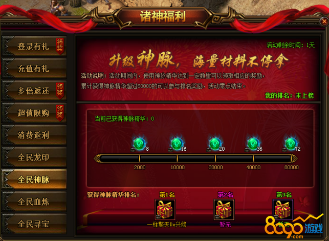 2、活动说明:活动期间,累积使用神脉精华以领取额外珍贵道具,达到一定额度还可以参与排行,排行奖励在活动结束第二天通过邮件发放。