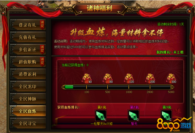 2、活动说明:活动期间,使用血炼材料达到一定数量可以领取相应的奖励,使用碎片超过5000的可以参与血炼排名奖励,活动零点结束。