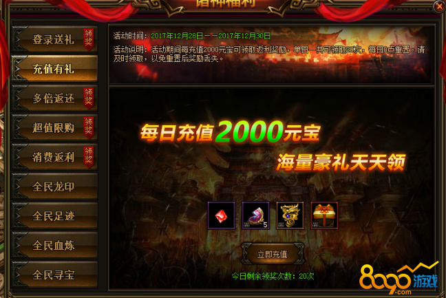2、活动说明:活动期间每充值2000元宝可领取返利奖励,单日一共可领取20次,每日0点重置。请及时领取,以免充值后奖励丢失。