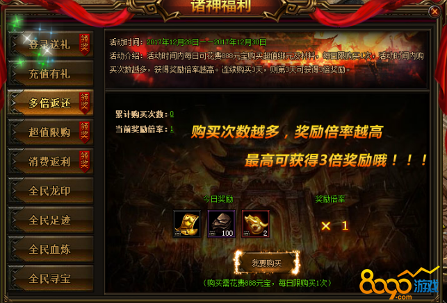 2、活动说明:每天花费888元宝,可以购买超值绑元及材料。每日限购一次,购买次数越多,获得奖励倍率越高,第三天可领取3倍奖励