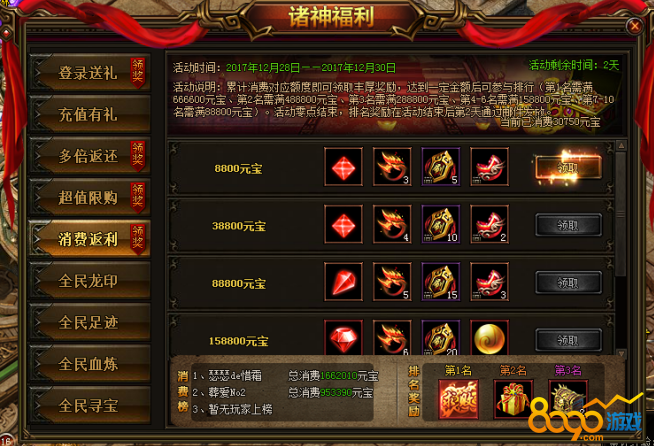 2、活动说明:累计消费对应额度可领取丰厚奖励,达到一定金额后可参与排行活动零点结束,排名奖励在活动结束后第二天通过邮件发放。