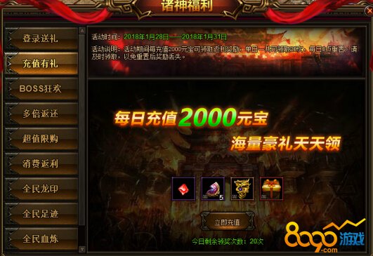 2、活动说明:活动期间每充值2000元宝可领取返利奖励,单日一共可领取20次,每日0点重置。请及时领取,以免充值后奖励丢失。