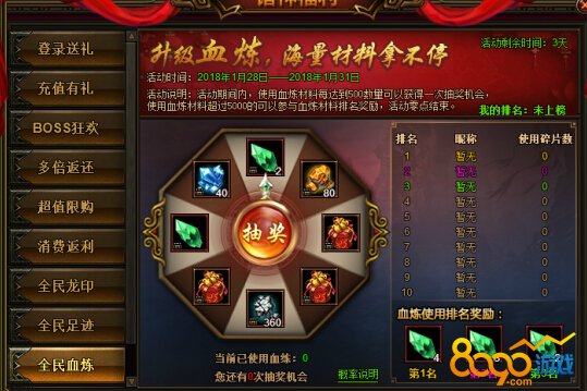 2、活动说明:活动期间,使用血炼材料达到一定数量可以领取相应的奖励,使用碎片超过5000的可以参与血炼排名奖励,活动零点结束。