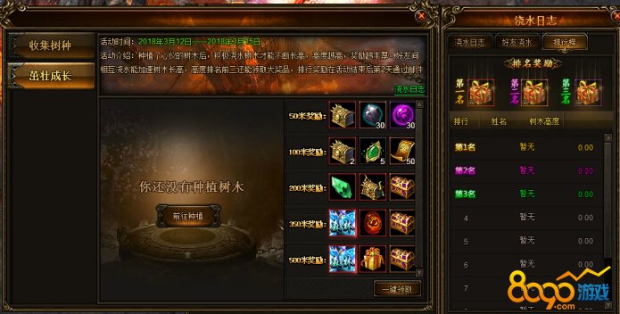 2、活动说明:活动期间击杀野怪、收集树种可以种下一颗属于自己的树木,通过免费浇水和元宝浇水可增加树木的高度,也可以帮其他玩家浇水,达到指定高度可以领取丰厚奖励,树木的高度将进行排行。