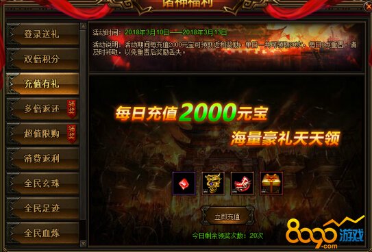 2、活动说明:活动期间每充值2000元宝可领取返利奖励,单日一共可领取20次,每日0点重置。请及时领取,以免充值后奖励丢失。