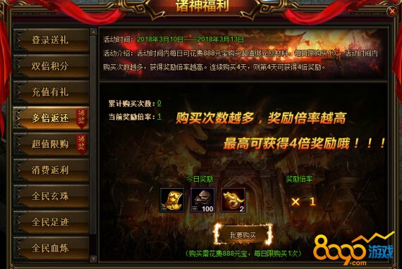 2、活动说明:每天花费888元宝,可以购买超值绑元及材料。每日限购一次,购买次数越多,获得奖励倍率越高,第四天可领取4倍奖励