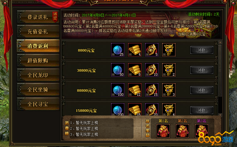 2、活动说明:活动期间内累计消费对应额度可获得丰厚奖励,达到一定金额则可参与排名(第1名需满666600元宝、第2名需满488800元宝、第3名需满288800元宝、第4-6名需满158800元宝、第7-10名需满88800元宝)、排名奖励在活动结束后第2天通过邮件发放。