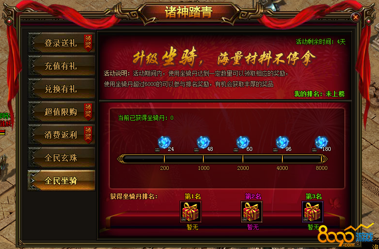 2、活动说明:活动期间内,使用坐骑丹达到一定数量可领取对应奖励,累计超过6000更可参与排名获得豪华奖励。