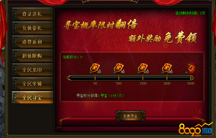 2、活动说明:活动期间内,寻宝几率翻倍,达到一定次数可获得寻宝令返利,达到最高标准可获得雷神之锤战宠。