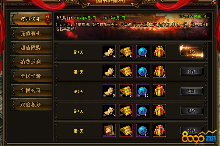 2、活动说明:活动期间,每日登陆可领取免费礼包一份,登陆越多礼包越丰厚哦。