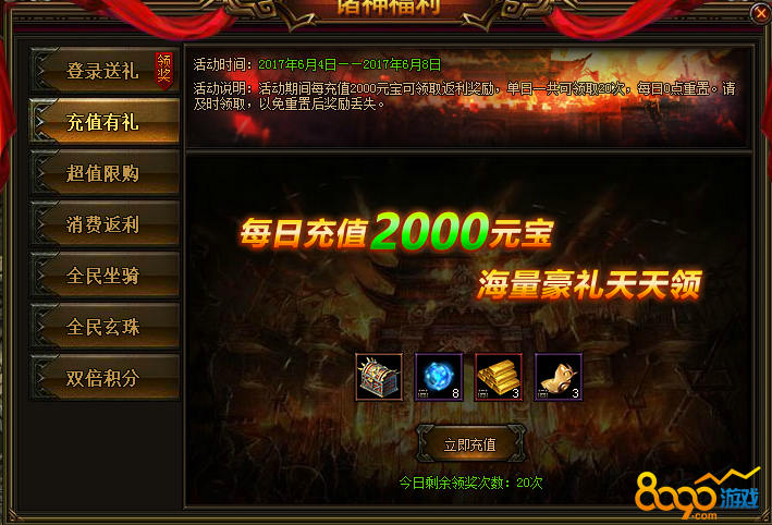 2、活动说明:活动期间每充值2000元宝可领取返利奖励,单日一共可领取20次,每日0点充值,请及时领取,以免充值后奖励丢失
