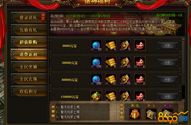 2、活动说明:累计消费对应额度可领取丰厚奖励,达到一定金额后可参与排行(第一名需满666600元宝,第二名488800元宝,第三名288800元宝,4-6名1588800元宝,7-10名88800元宝)。活动零点结束,排名奖励在活动结束后第二天通过邮件发放。
