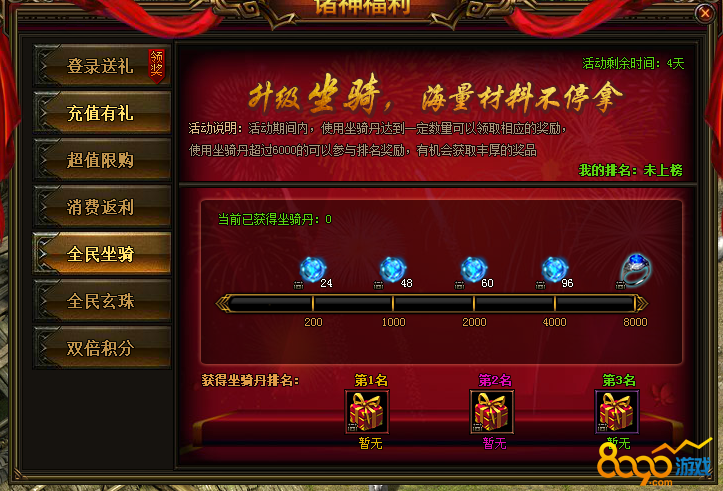 2、活动说明:活动期间,使用坐骑丹达到一定数量可以领取相应的奖励,使用碎片超过6000的可以参与坐骑排名奖励,活动零点结束。