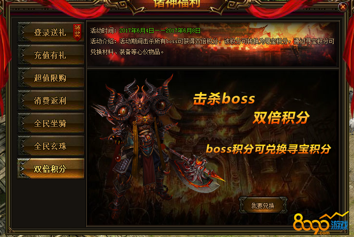 2、活动说明:活动期间击杀所有BOSS可以获得双倍积分,该积分可转换为寻宝积分,通过寻宝积分可兑换材料,装备等心仪物品