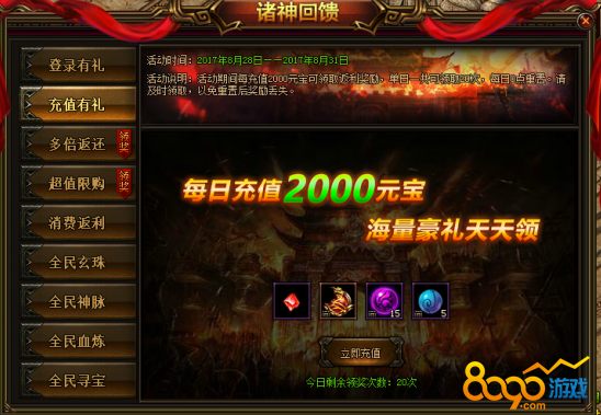 2、活动说明:活动期间每充值2000元宝可领取返利奖励,单日一共可领取20次,每日0点重置。请及时领取,以免充值后奖励丢失。