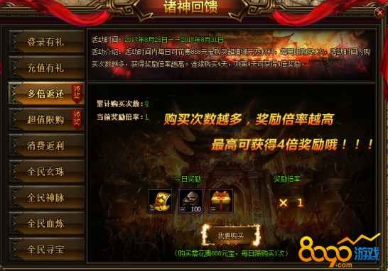 2、活动说明:每天花费888元宝,可以购买超值绑元及材料。每日限购一次,购买次数越多,获得奖励倍率越高,第三天可领取3倍奖励