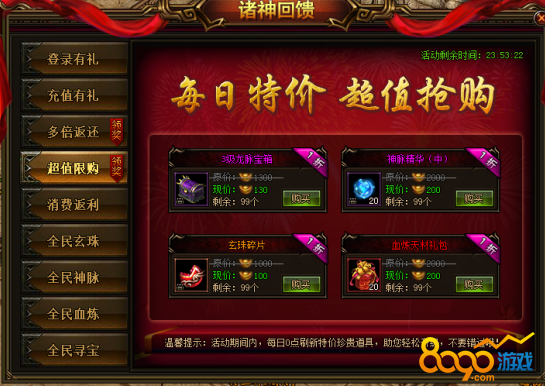 2、活动说明:活动期间内,每日0点刷新特价珍贵道具。
