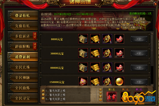 2、活动说明:累计消费对应额度可领取丰厚奖励,达到一定金额后可参与排行活动零点结束,排名奖励在活动结束后第二天通过邮件发放。