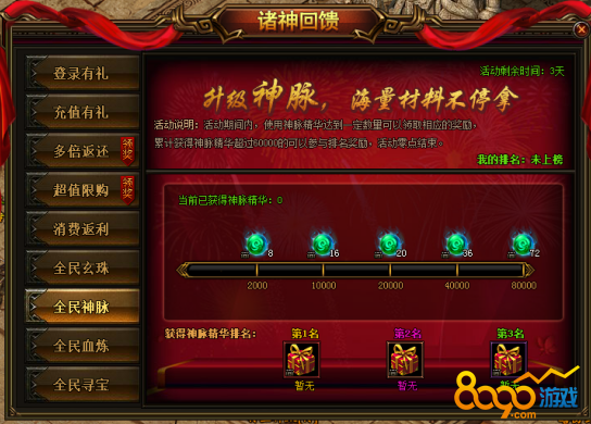 2、活动说明:活动期间,累积使用神脉精华以领取额外珍贵道具,达到一定额度还可以参与排行,排行奖励在活动结束第二天通过邮件发放。