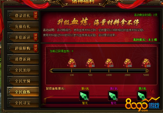 2、活动说明:活动期间,使用血炼材料达到一定数量可以领取相应的奖励,使用碎片超过5000的可以参与血炼排名奖励,活动零点结束。