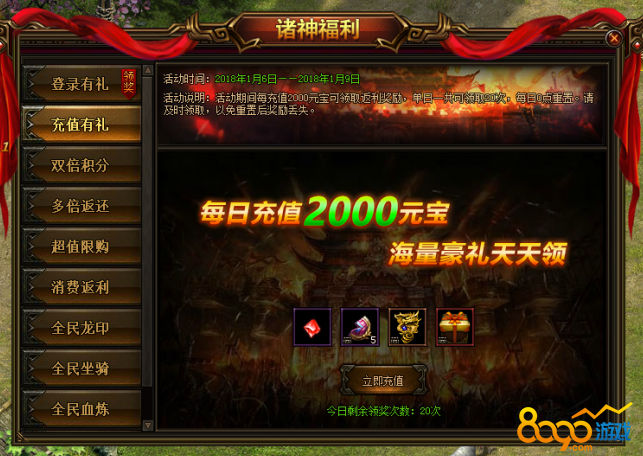 2、活动说明:活动期间每充值2000元宝可领取返利奖励,单日一共可领取20次,每日0点重置。请及时领取,以免充值后奖励丢失。