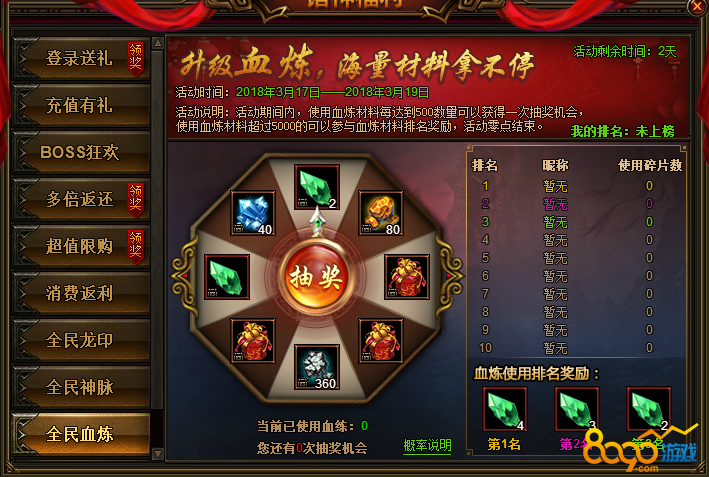 2、活动说明:活动期间,使用血炼材料达到一定数量可以领取相应的奖励,使用碎片超过5000的可以参与血炼排名奖励,活动零点结束。