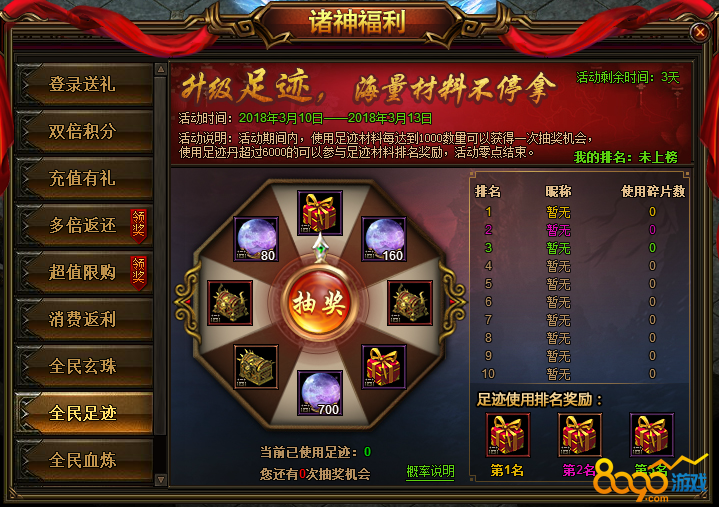 2、活动说明:活动期间,累积使用足迹丹以领取额外珍贵道具,达到一定额度还可以参与排行,排行奖励在活动结束第二天通过邮件发放。
